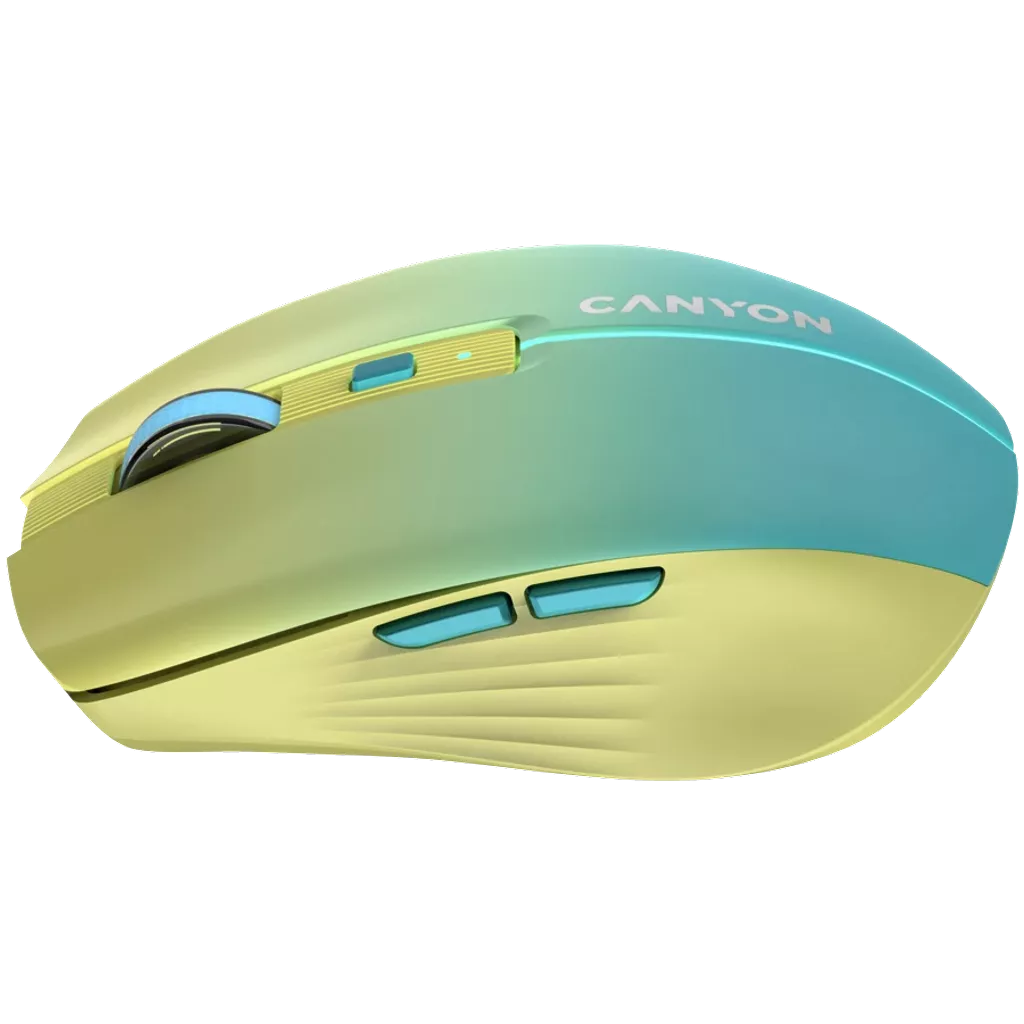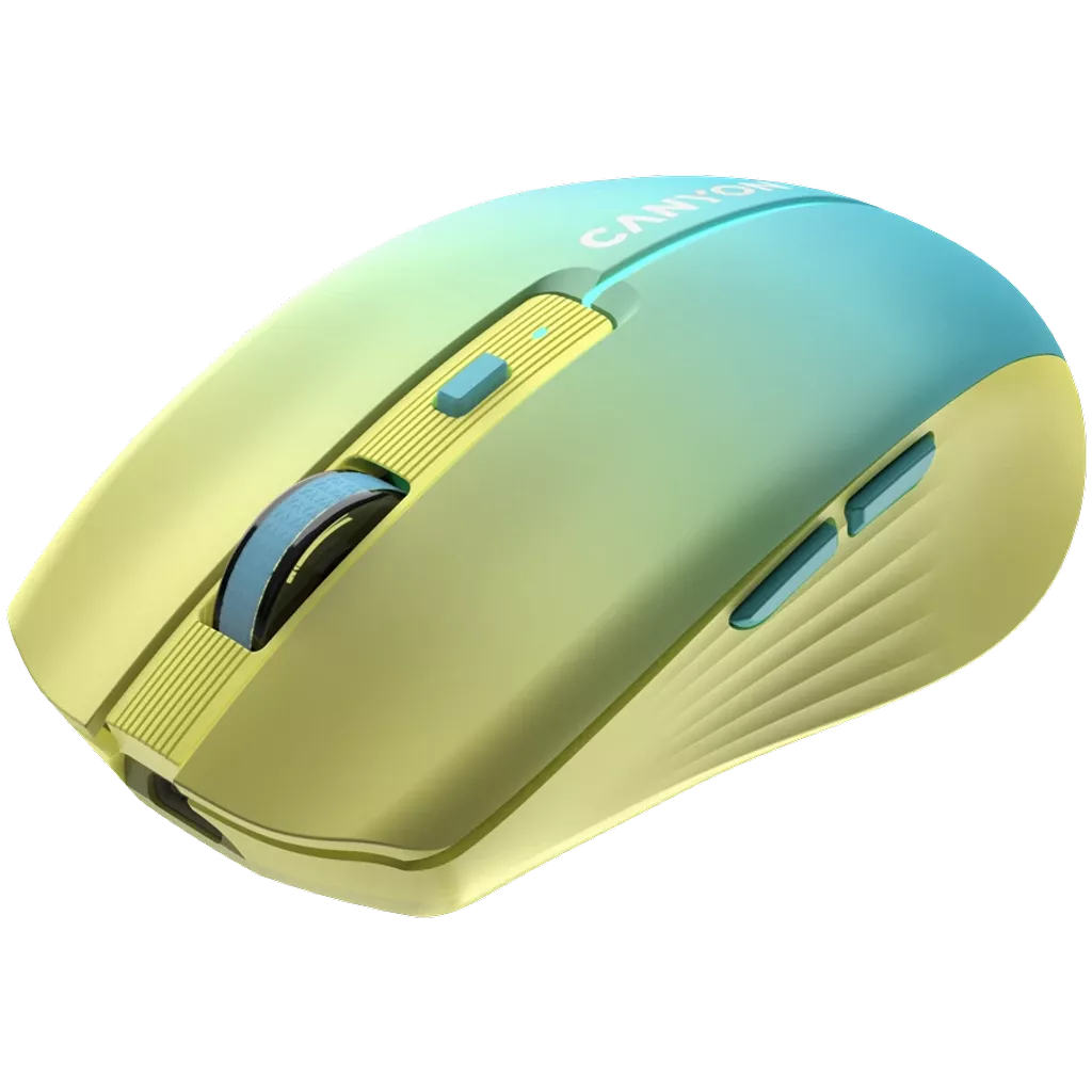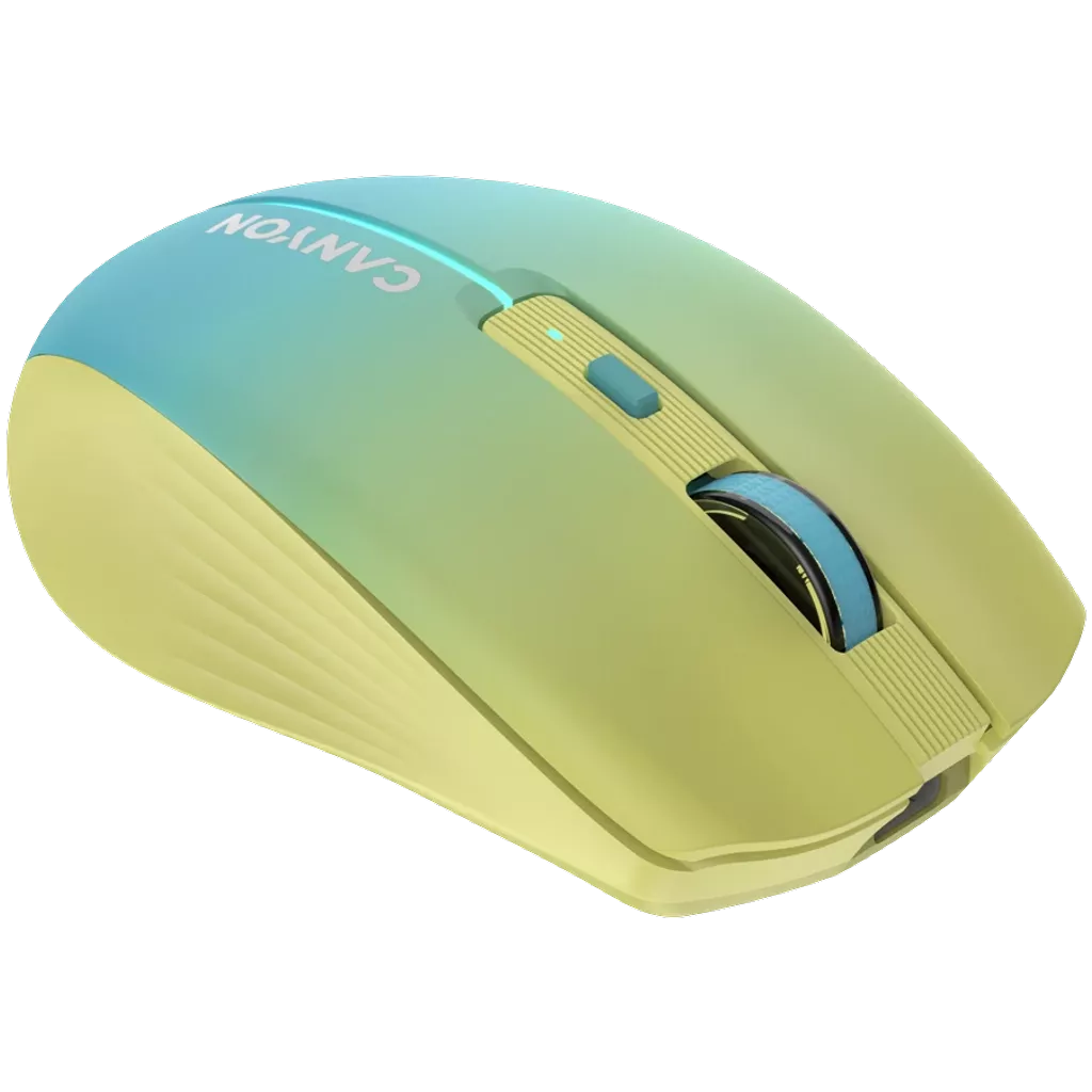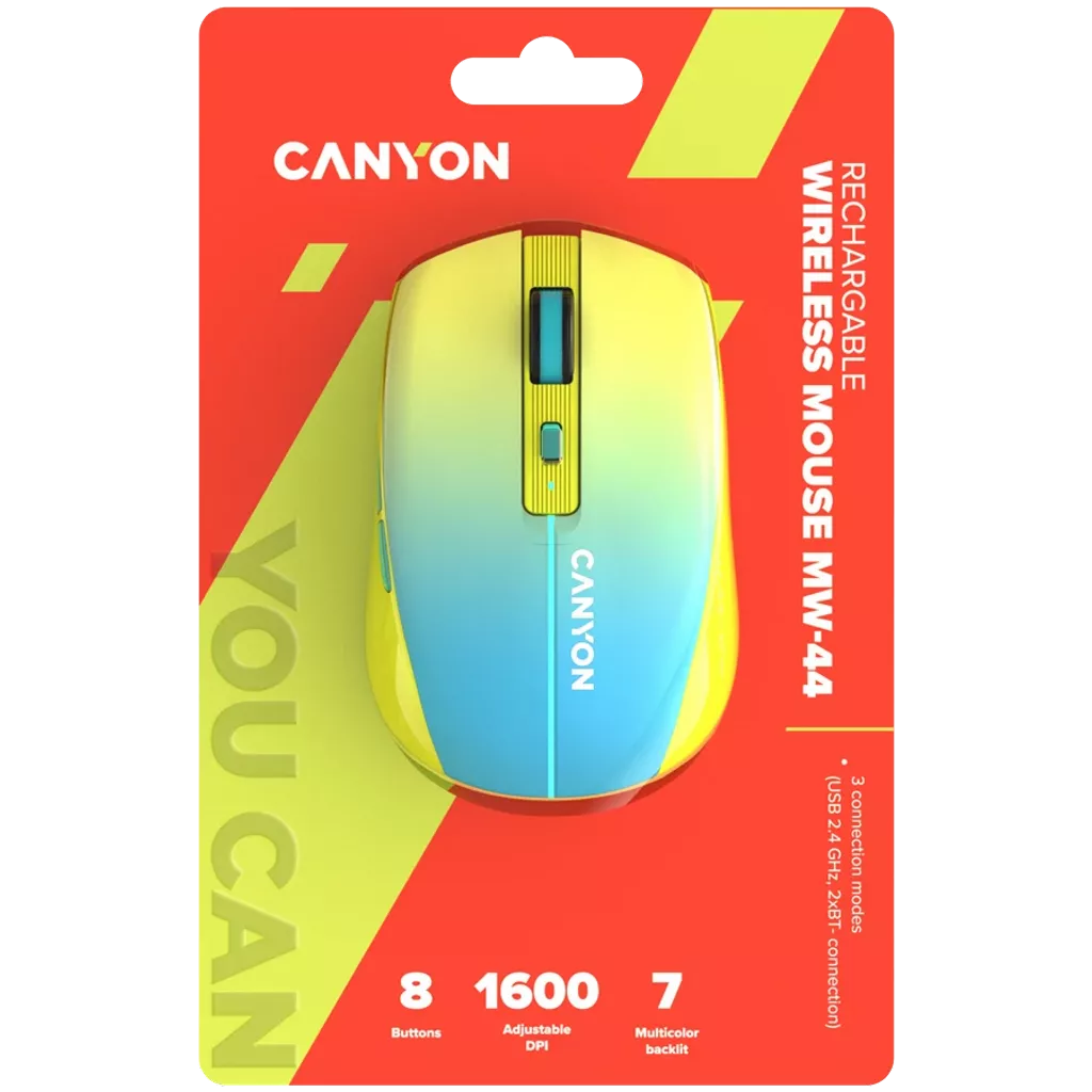 Canyon CNS-CMSW44UA. Factorul de formă: Mâna dreaptă. Mişcarea tehnologie de detectare a: Optice, Interfață dispozitiv: RF Wireless + Bluetooth, Rezoluţia de circulaţie: 1600 DPI, Tip de butoane: Butoane apăsate, Cantitatea Buttons: 8, Tip de derulare: Rotiță. Culoare iluminare: Multi. Sursă de alimentare: Baterii. Culoarea produsului: Albastru, Galben