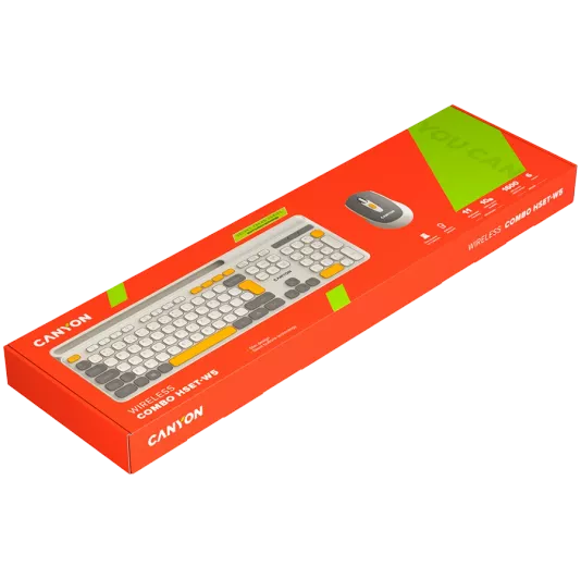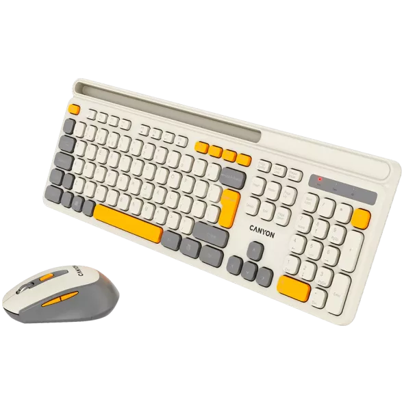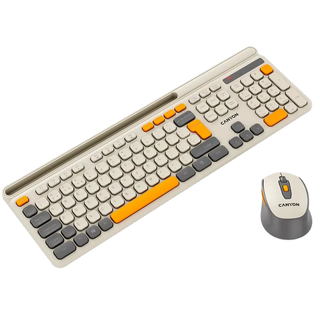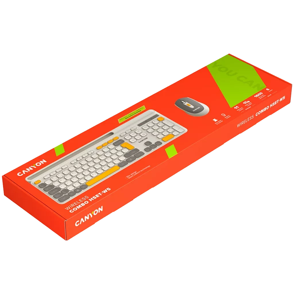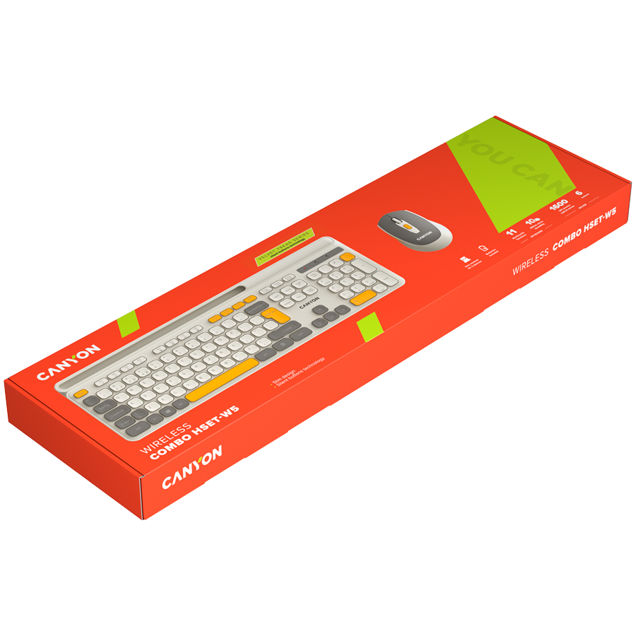 Canyon HSET-W5. Factor formă tastatură: Mărime completă (100%). Stil tastatură: Drept. Tehnologia de conectare: Fără fir, Interfață dispozitiv: RF fără fir, Comutator tastatură: Comutator de tastatură, Schemei de tastatură: QWERTY, Numărul de taste ale tastaturii: 105, Utilizare recomandată: Casă / Birou. Culoarea produsului: Bej. Mouse inclus