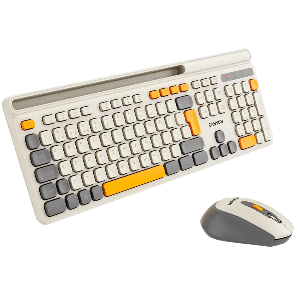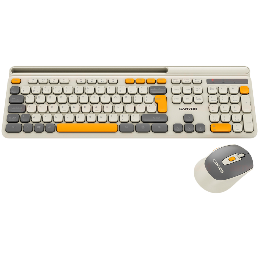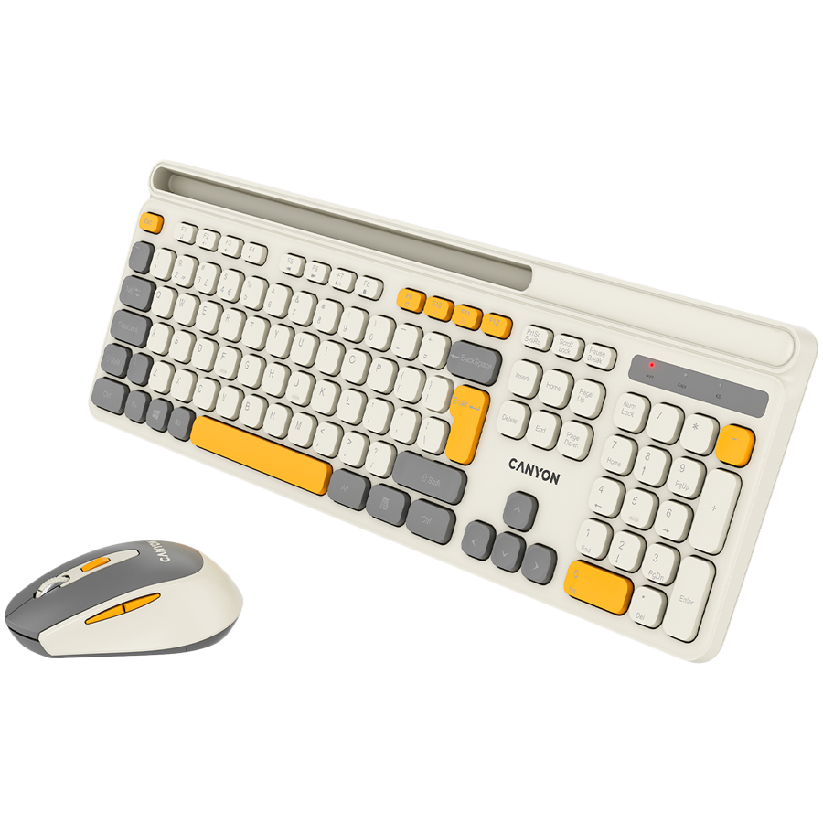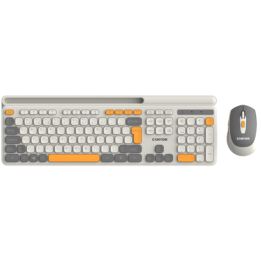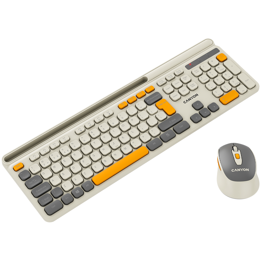 Canyon HSET-W5. Factor formă tastatură: Mărime completă (100%). Stil tastatură: Drept. Tehnologia de conectare: Fără fir, Interfață dispozitiv: RF fără fir, Comutator tastatură: Comutator de tastatură, Schemei de tastatură: QWERTY, Numărul de taste ale tastaturii: 105, Utilizare recomandată: Casă / Birou. Culoarea produsului: Bej. Mouse inclus