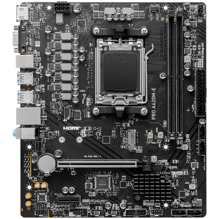 MSI PRO A620M-E este o placă de bază mATX performantă, destinată profesioniștilor care caută fiabilitate și viteză. Cu un socket AM5 și suport pentru memorie DDR5 la viteze de peste 6800 MHz, această placă oferă un singur slot PCIe x16 și un slot M.2, facilitând expansiunea rapidă. Conectivitatea extinsă, inclusiv HDMI, VGA și multiple porturi USB, asigură integrarea ușoară în orice sistem de lucru.
